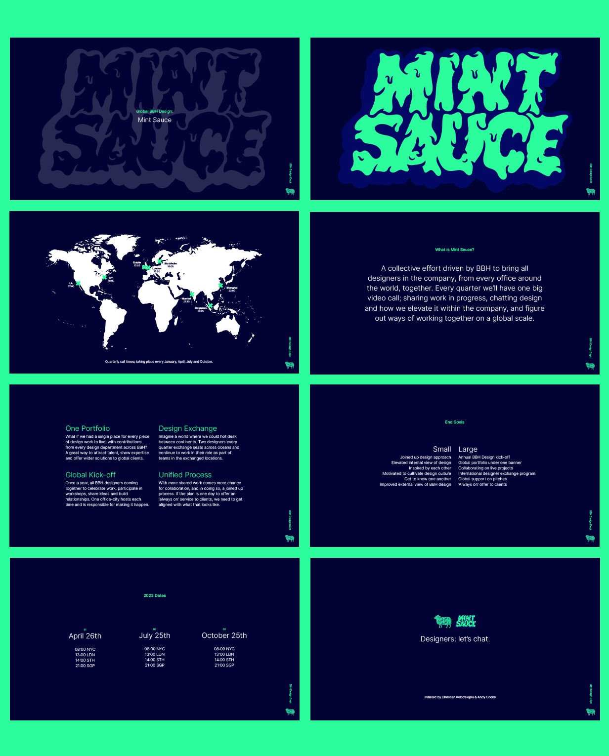 I was keen to connect to the global BBH offices through their design teams, with a view to create a joined-up, worldwide design culture at BBH. For this endeavour, we developed a series of quarterly meetups called Mint Sauce — a place to share work, discuss design, process and meet fellow black sheep from around the world. Each meeting was hosted by a different office, with the visual identity changing each time as it was developed by the design teams from said office.