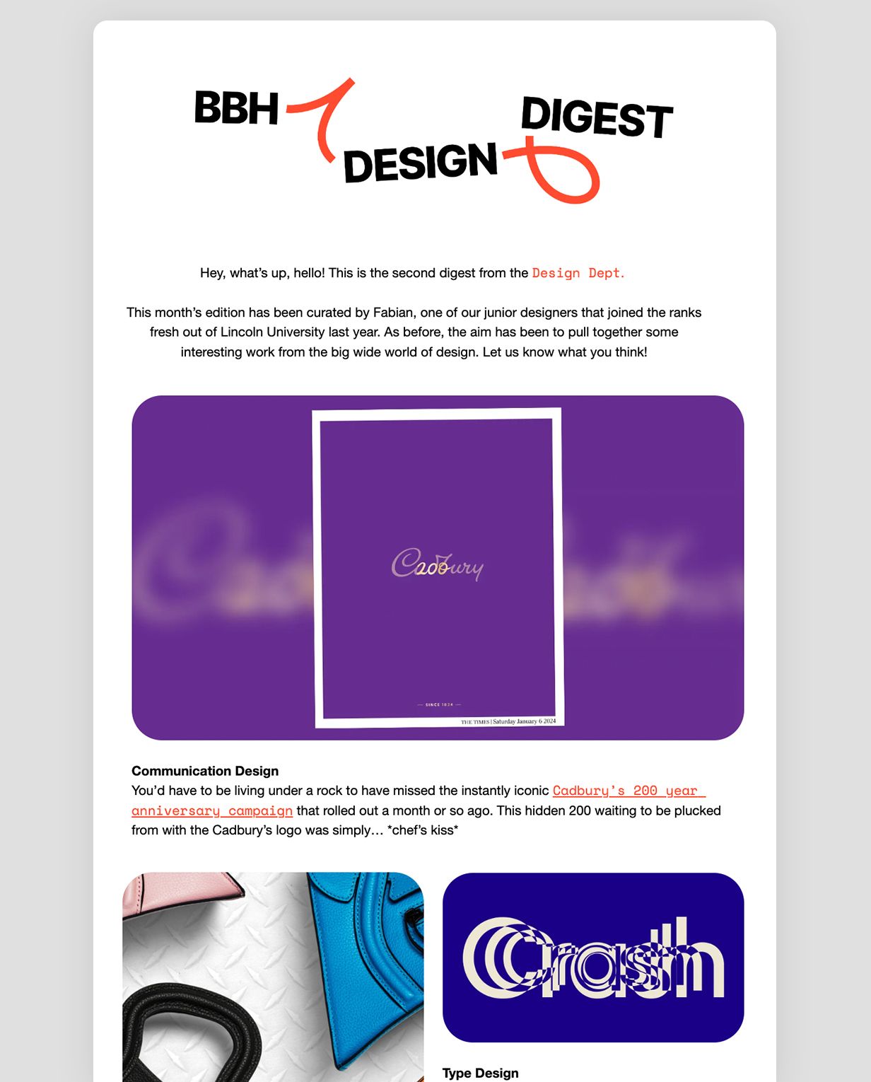 To get the agency more educated by all things design, we developed a monthly all-agency e-mail newsletter that celebrates work from around the world of design. Taking it in turns through the whole design department to curate stand out projects from communication design, type design, fashion design, interior design, identity design, digital design (and so on), the result was a regular-enough-but-not-overbearing flow of design-led inspiration for everyone.