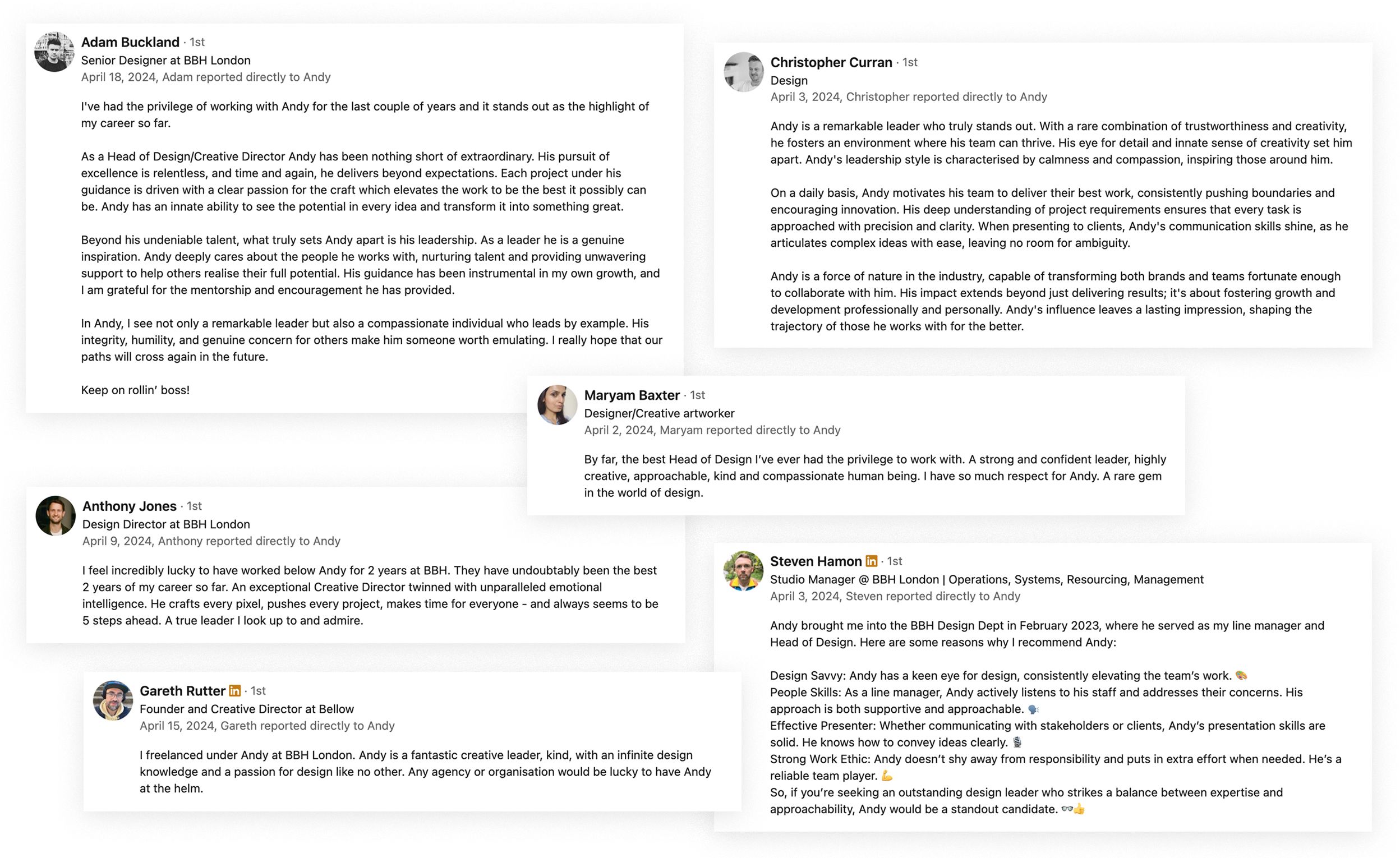 I lead from the front, asking the team to come along rather than telling them where to go. I give time, attention, empathy, trust, autonomy and respect — and I've been lucky enough to get it back in spades as the below testimonials on my LinkedIn show.