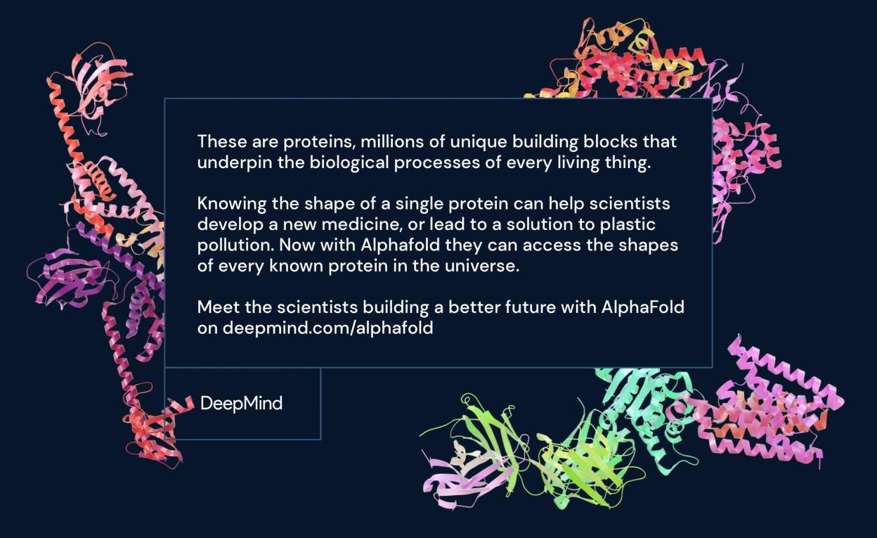 Inside every cell in your body, billions of tiny molecular machines called proteins are hard at work. They allow your eyes to detect light, your neurons to fire, and the unique ‘instructions’ in your DNA to be read. Think of them as the building blocks of life. By solving a decades-old scientific challenge, Deepmind's AI system is helping to solve crucial problems like treatments for disease or breaking down single-use plastics. One day, it might even help unlock the mysteries of how life itself works.