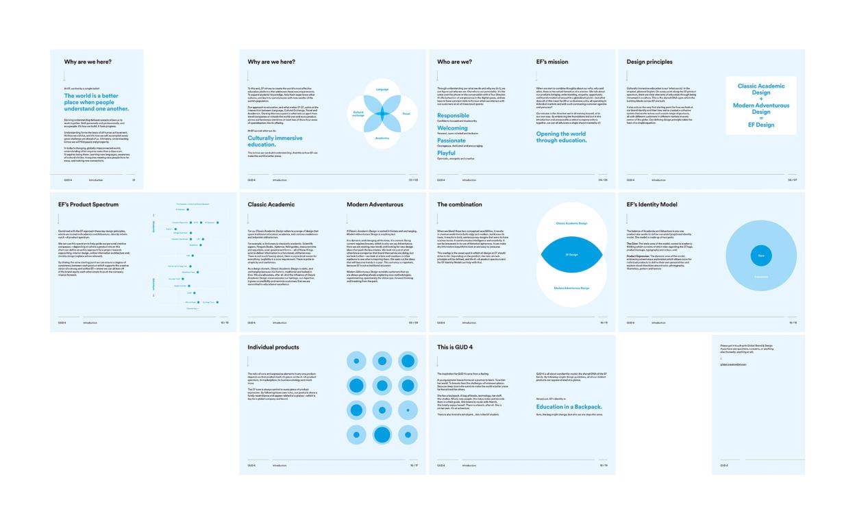EF’s G.U.D. 4 is preceded by a strategy layer that informs the entire thinking for the fourth edition documentation. EF had never before had this strategic layer as part of their identity usage guide. We worked to define this approach for EF over the course of 18 months alongside integral EF figureheads in London and Boston, as well as commissioning external agencies for input and concepts.