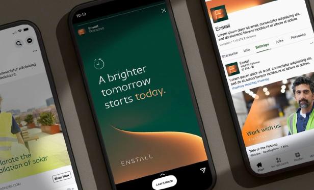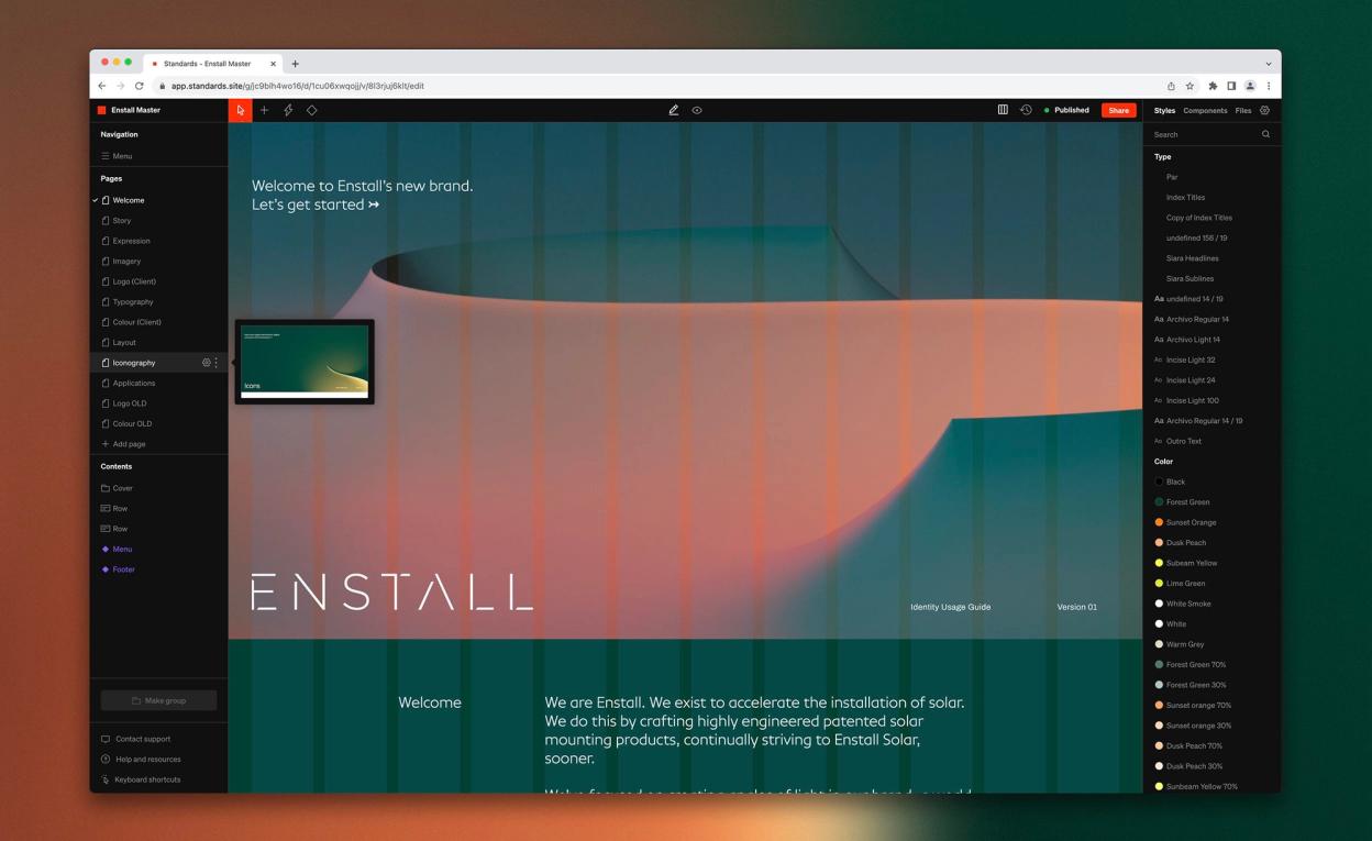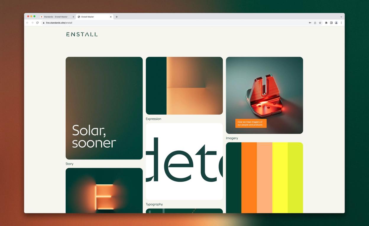 We worked on the brand identity guidelines platform 'Standards' to build a reactive and dynamic set of guideline documentation. This enabled us to bring in motion examples to the guidelines, as well as other native features such as type testers, all of which together allows the internal Enstall design team to download assets and view documentation quickly — as well as being able to update and modify inline with the organic growth of the brand identity.