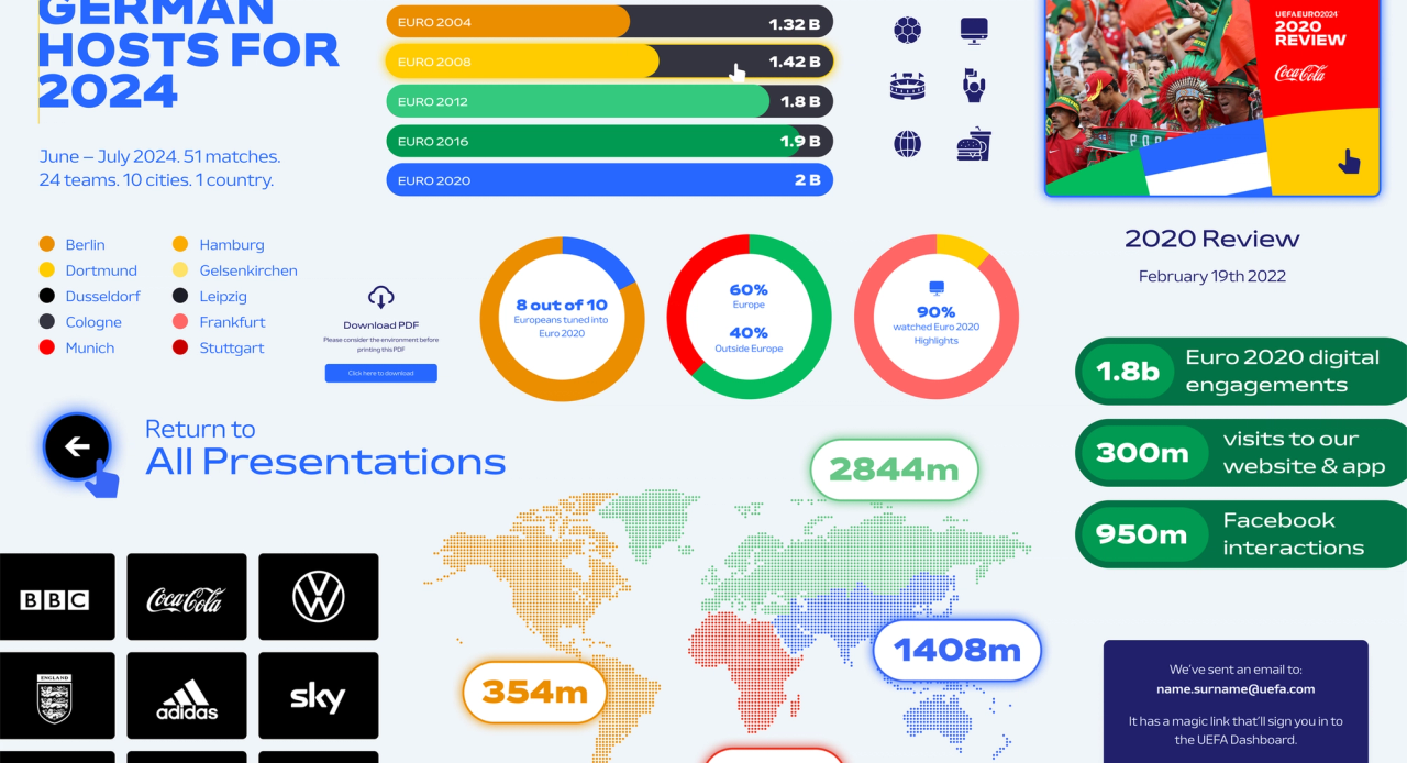 UEFA entice potential corporate partners in the traditional way — through static, flat, bulky PowerPoint presentations. I worked with them to develop a new digital platform for Euro 2024 that changed the way these presentations are shared.
