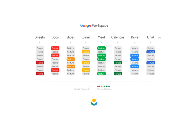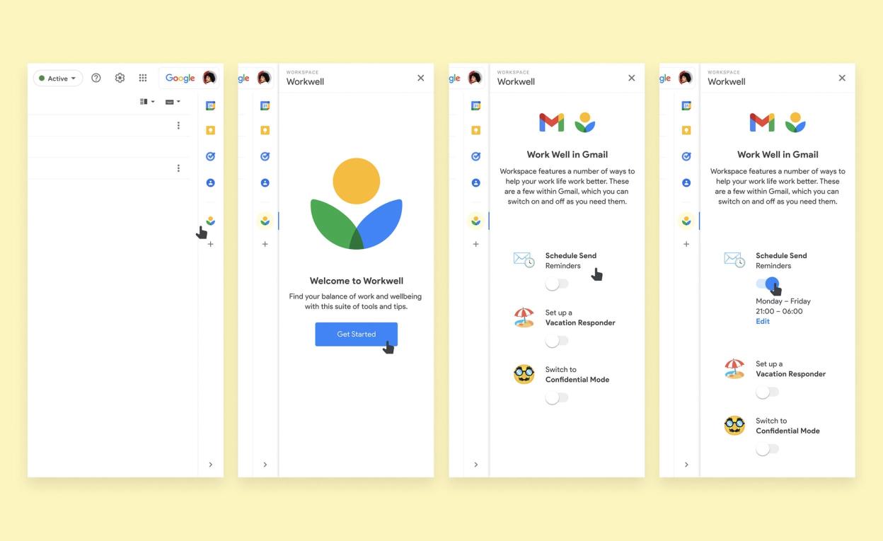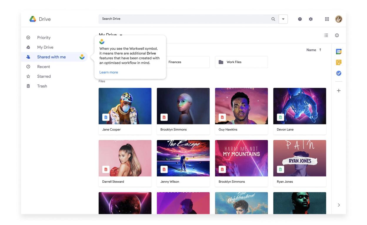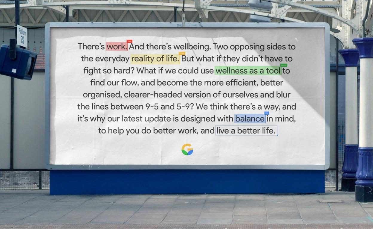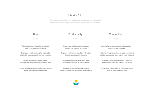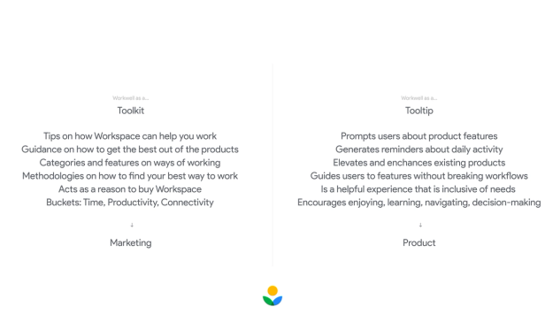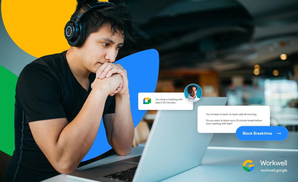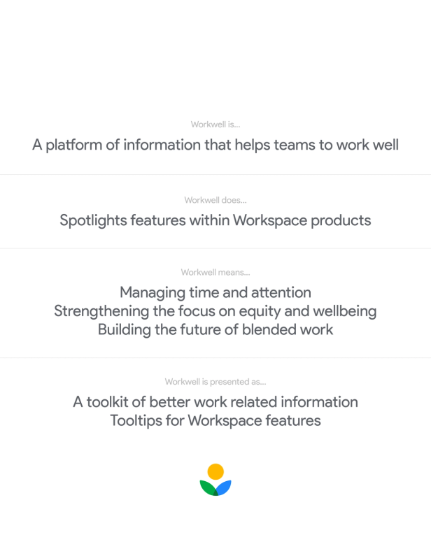 A platform of information that helps teams to work well, spotlighting features within Workspace products. For Google Workspace, working well meant managing time and attention, strengthening the focus on equity and wellbeing and building the future of blended work. I worked on the visual identity for a Workwell toolkit of better work related information, and product tooltips for highlighting those Workspace features.