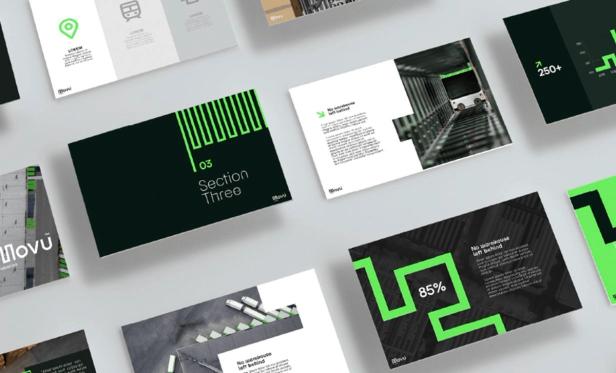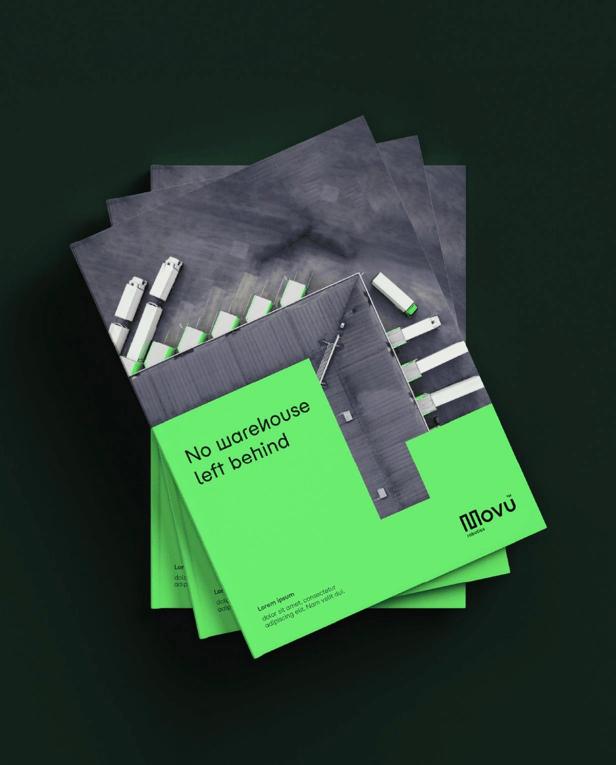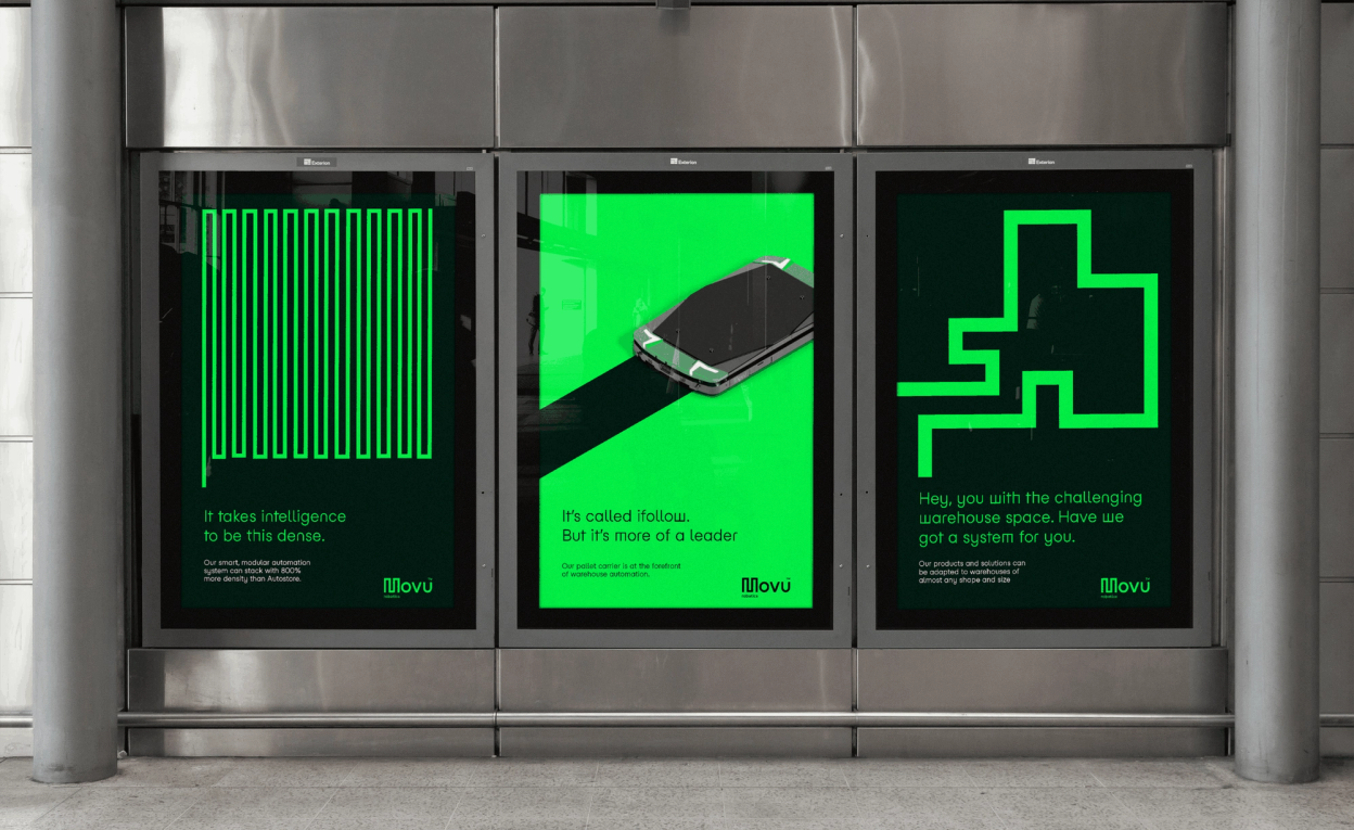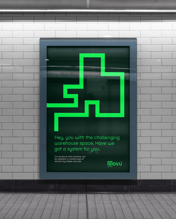 At the centre of the identity is the 'Movuline' — based off the M from the wordmark — which itself mirrors the racking systems built by parent company, Stow. The Movuline's movement echoes that of a robot through a grid of warehouse racking, rendered across 2D and 3D planes. This unique graphic device opens a world of illustrative possibility for simple communications concepts and for ownable, memorable branded elements, too.