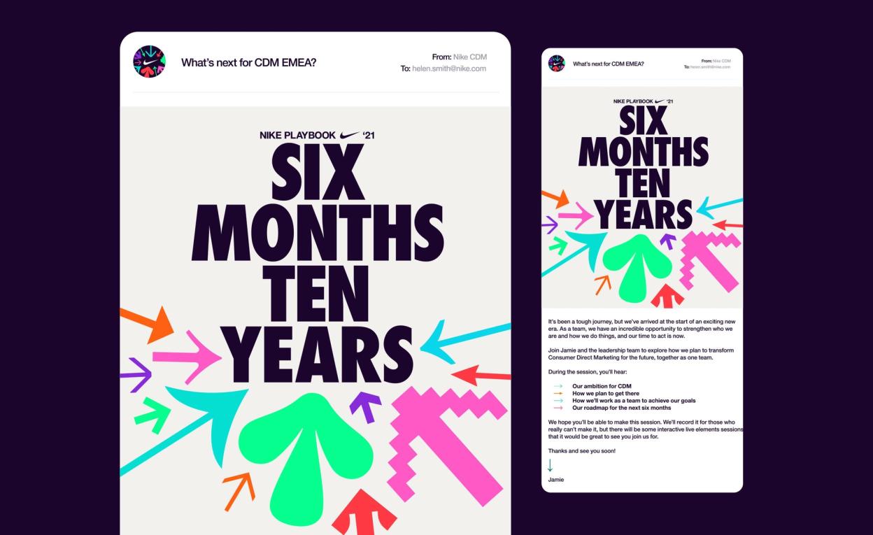 A visual language designed to provide clarity in a time when it’s needed most, the Nike CDM team required a compelling and fun way to pull staff in the same direction. For use across internal events big and small, giveaways and for inspiration, I led the design direction on the project that gave the new look Nike CDM team a new look to align with.