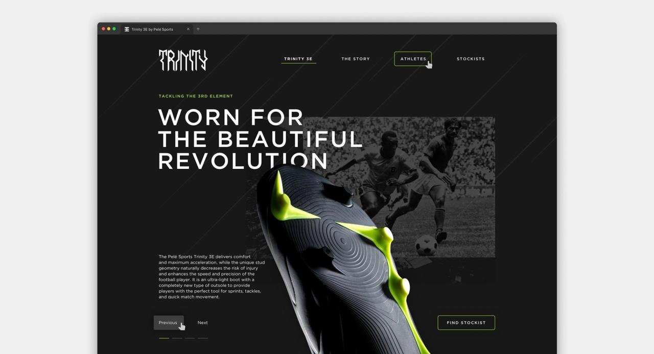 The primary objective of the site was to showcase the boot and the technology that informed its creation. Secondly, it was important to build on the story around Pelé, and how the world's greatest footballer's heritage helped build the Pelé Sports brand, of which the Trinity 3E boot was the jewel in the crown of the product range.