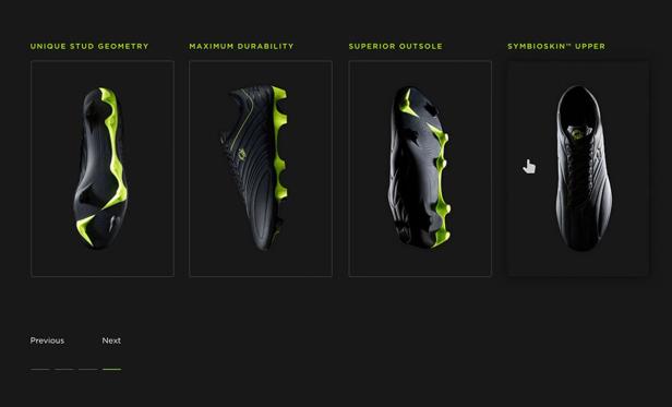 The area 'above the fold' on the home page was identified as the key area to show off not only the boot and its attributes, but supply a glimpse to the story that helped create the product. Whilst automatic, the user can also control a pull page carousel in this space to reveal more images of the boot and refreshed images of Pele's illustrious career.